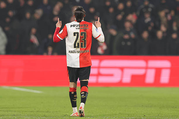 Ses prestations ne tardent pas à susciter l’intérêt de clubs plus huppés. En juin 2024, Feyenoord Rotterdam frappe un grand coup en s’attachant ses services. Sous la houlette d’Arne Slot, entraîneur alors reconnu pour sa capacité à sublimer les talents offensifs — aujourd’hui à la tête de Liverpool — Hadj Moussa change définitivement de dimension. Il ne s’agit plus seulement de confirmer, mais de s’imposer dans un club habitué aux joutes européennes et aux exigences du très haut niveau.