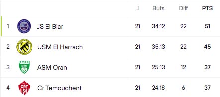 Les Témouchentois rejoignent ainsi l’ASM Oran à la troisième place (37 pts chacun), cette dernière étant allée s’imposer en déplacement chez le RC Arbaa (1-0), toujours menacé par la relégation. De son côté, la JSM Tiaret a signé une victoire convaincante face à la JS Tixeraïne (4-1), confortant sa position dans le ventre mou (7e, 31 pts), tandis que le WA Tlemcen a pris le meilleur sur le WA Mostaganem (1-0) pour se hisser à la 8e place.
